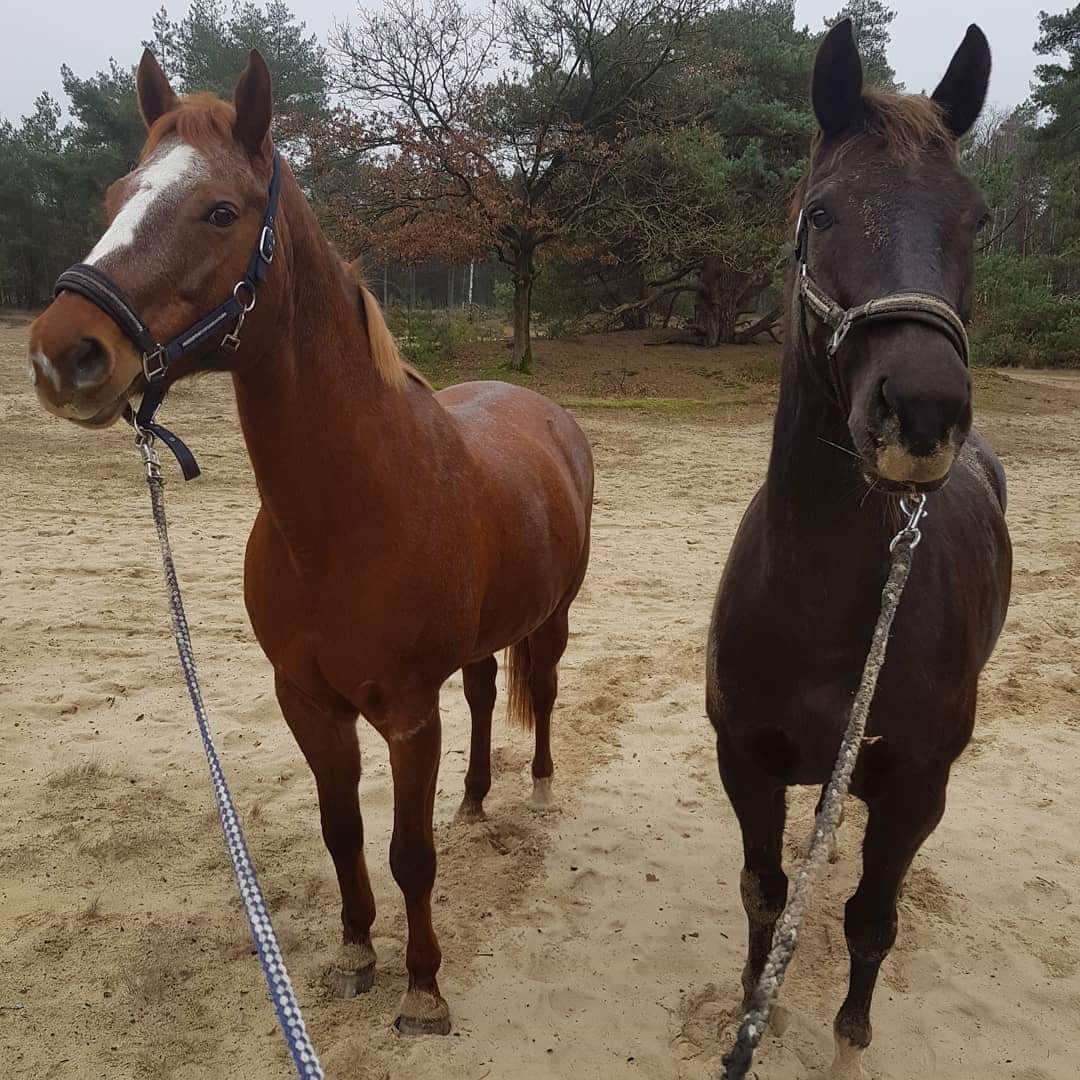 G-Boyd 9 jarige kwpn ruin met terugkomende “mok” zonneallergie met vollopend been en gevoelige darm door een start op jonge leeftijd met een flinke bloedworm infectie en Yentl 14 jarige quarter merrie met gevoeligheid voor gras/suikers en die snel schram in het lijf is.