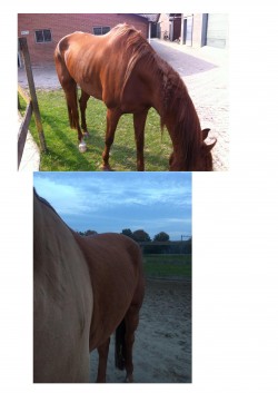 Totdat hij op 13 augustus ineens koliek had. De paarden stonden net 2 uurtjes binnen vanuit de wei. In al die 18 jaar had hij nog nooit koliek gehad dus de alarmbellen gingen bij mij af. Dierenarts erbij en hij had gaskoliek. Gespoten en het zou nu weer goed moeten gaan. Nog geen 20 minuten later stond hij weer lekker te eten. Toch was ik er niet gerust op en zorgde dat ik de volgende dag rond dezelfde tijd weer was. En ja hoor, weer lichte koliek. Dit patroon herhaalde zich tot zondag en daarom zijn we maandag direct naar Utrecht gegaan. Hier heeft hij 4 dagen gestaan, veel moeten vast i.v.m. de onderzoeken en natuurlijk veel stress gehad van alleen in een vreemde omgeving 24/7 op stal. Ondanks de goede verzorging, de enorme box en de stapmolen waar hij vaak in kwam zag ik hem letterlijk verdwijnen en interen. Na diverse maagscopes bleek dat zijn maag niet goed ledigde en hierdoor ontstond ook gas in de darmen. Dit verklaarde wel waarom hij na ongeveer 2 uur op stal stopte met eten en ongemakkelijk werd. Op woensdag leek het goed te gaan maar toen kreeg hij ’s middags weer lichte koliek. Hij had in 24 uur 1 kilo kuil op en wat slobber…als dit alweer koliek zou veroorzaken hoe krijg ik dan ooit mijn paard weer fit en kan hij nog een paar waardig leven leiden. Donderdagochtend is er nog een EMG onderzoek gedaan en hieruit kwam dat het wellicht een neurologische oorzaak kon hebben dat de maag niet goed ledigde. Ik mocht hem komen halen, kreeg een advies mee (onder andere laxerend voeren) en succes verder!