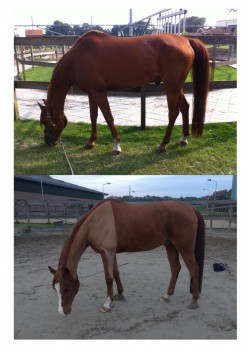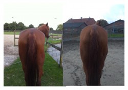 We zijn nu 2,5 maand (october 2015) verder en het is wel tijd voor een update! Ik ben weer aan het lessen, rijden weer lekkere trainingen buiten en wat geweldig is, hij eet als een dokwerker! Zijn prutjes die hij minimaal 3 keer per dag krijgt gaan er in als een malle, hij staat te smakken als ik met het voer aankom. Hij eet zijn kuil en hooi beter dan ooit! En vanaf het moment dat hij uit de kliniek is, heeft hij geen koliek meer gehad. Hij bouwt weer spieren op en hij heeft praatjes voor tien. En hij krijgt dus alleen nog maar voer op basis van vet. Geen granen en zetmeel meer. Hij zit ook losser in zijn lijf en heeft minder last van spierpijn na een training.