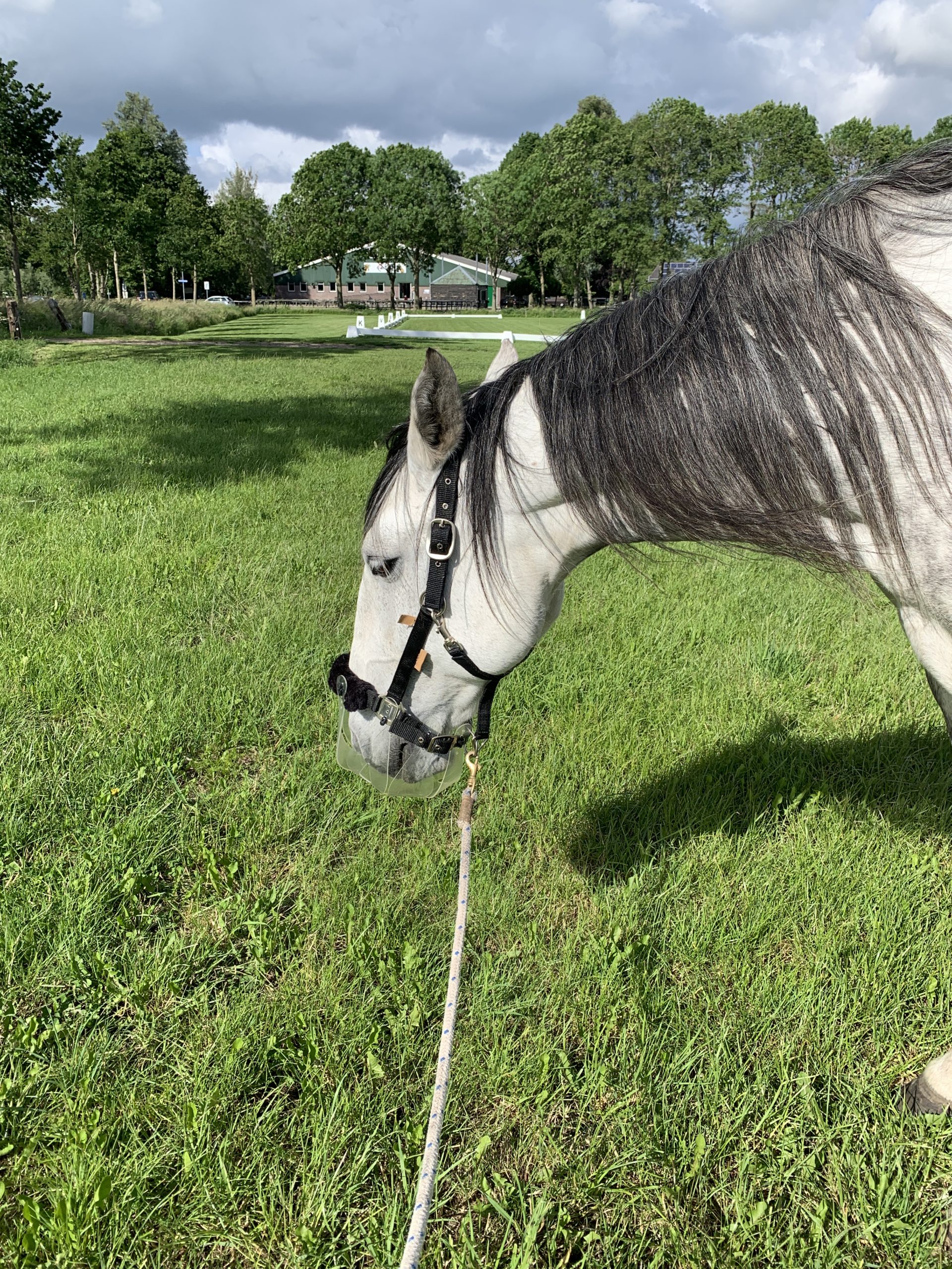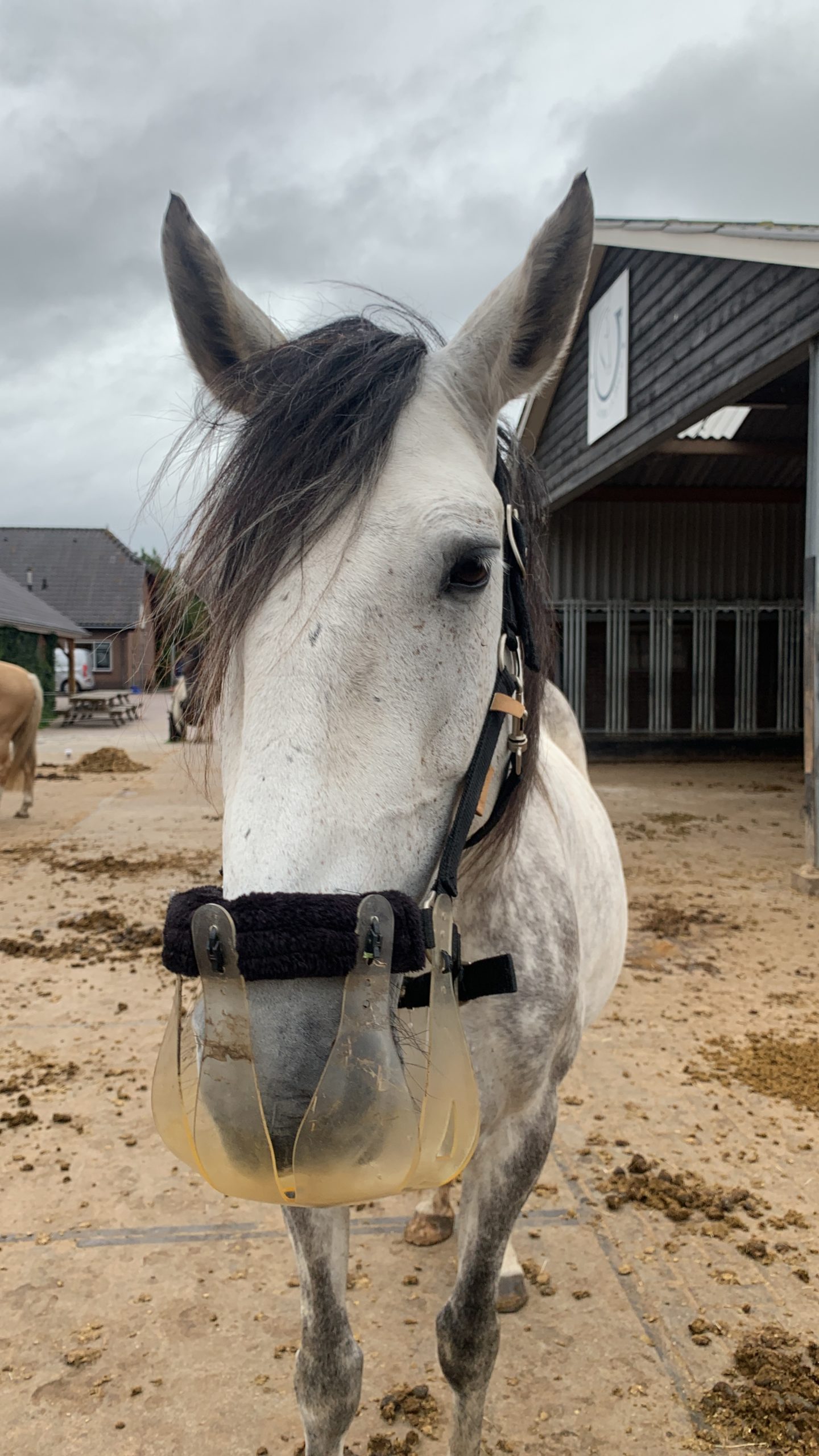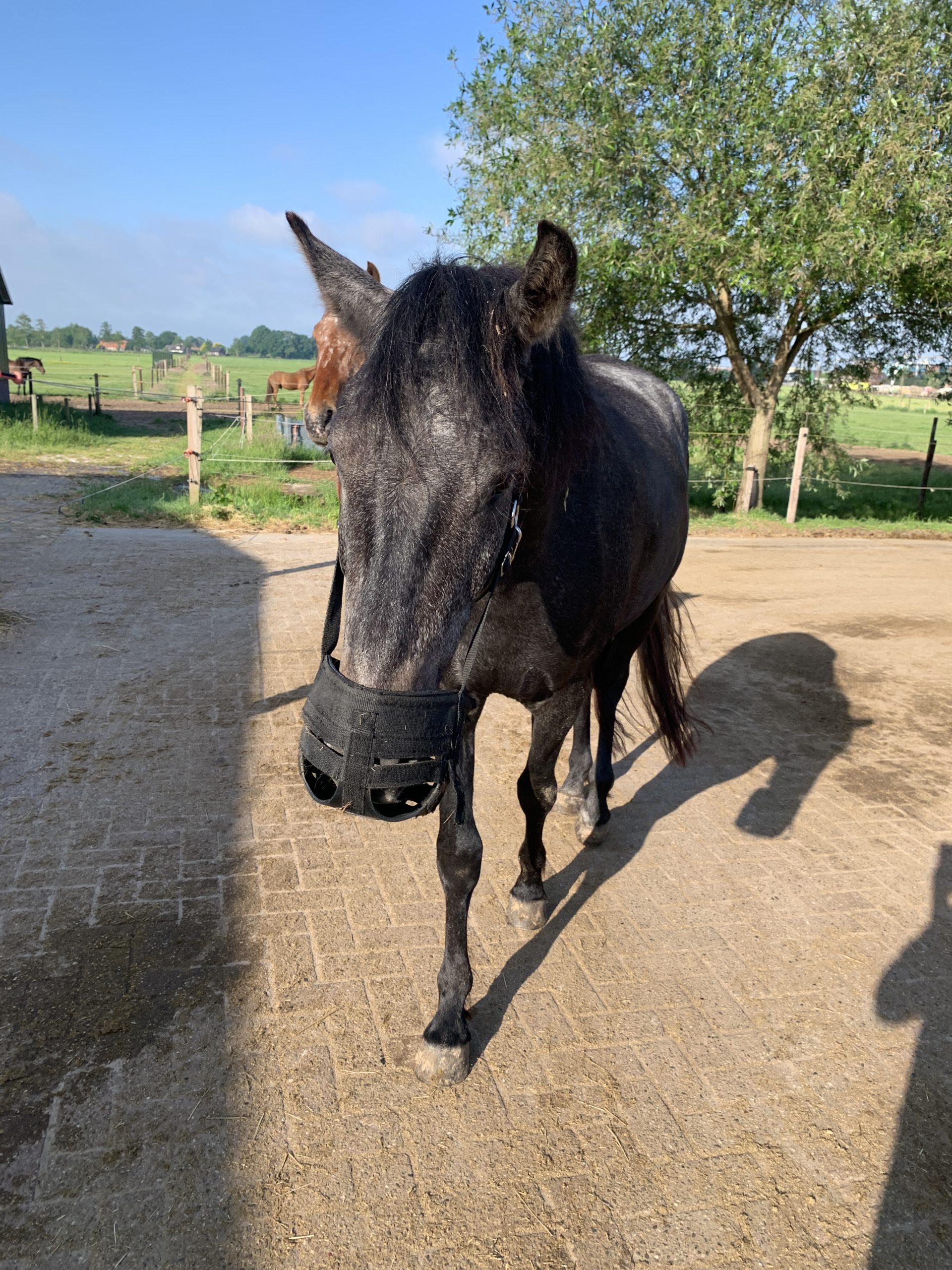 Van de andere maskers draaide hij weg, bij dit masker steekt hij probleemloos zijn neus erin. Ook gaat dit graasmasker – tot mijn verbazing – veel langer mee dan de andere maskers. De stoffen maskers moest ik heel vaak repareren met naald en draad. Bij het Thinline graasmasker hoef ik enkel regelmatig een tie-rip te vervangen.