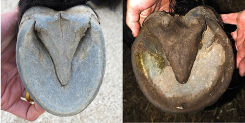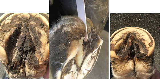 5. Meestal is de hele paardenhoef verder ook uit balans: de teen is te lang, de hielen zijn ondergeschoven, steunsels overgroeid. Rotstraal komt zelden ‘alleen’.